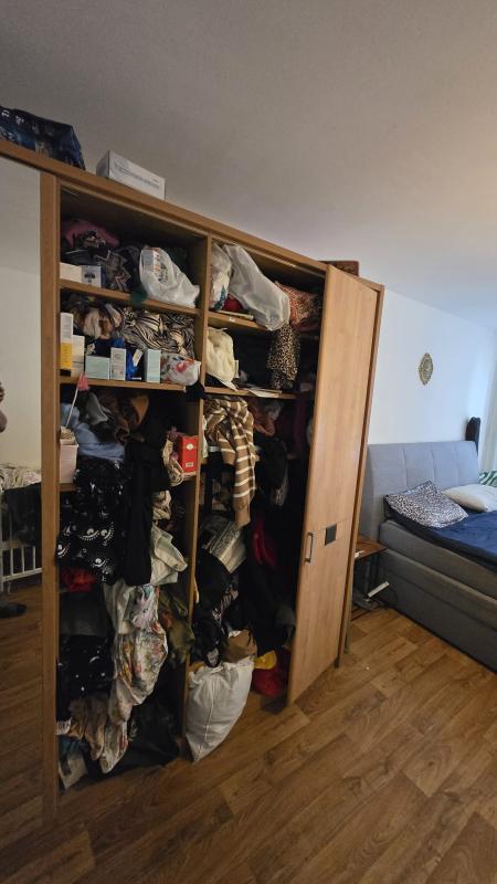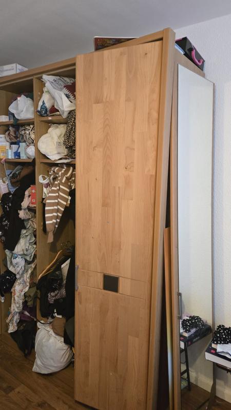 Der Kleiderschrank ist beschädigt und soll vor Ort repariert werden. Keine weiteren Details zur Größe oder zum Schadensbild angegeben.